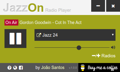 JazzOn is a very compact radio player for listen to internet radio stations featuring Jazz music. You can choose from a list of radio stations featuring Jazz music and listen to them. You can also add or import from playlist file your favorite Internet radio stations.